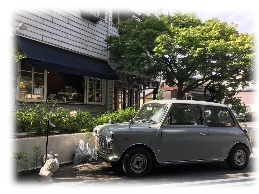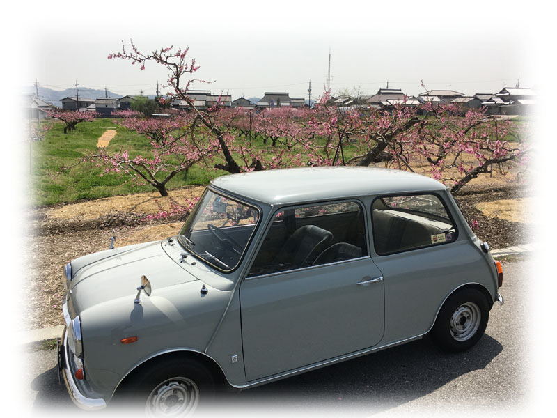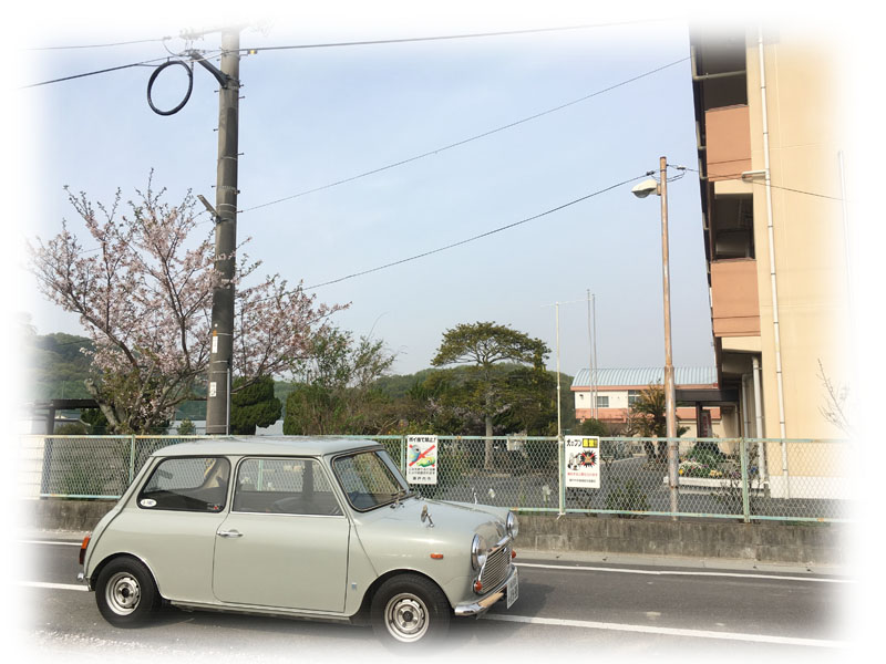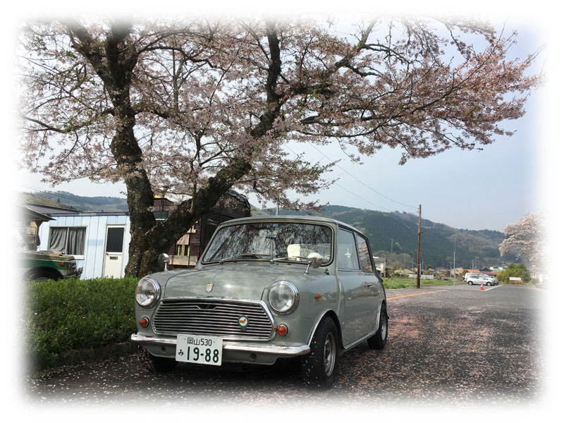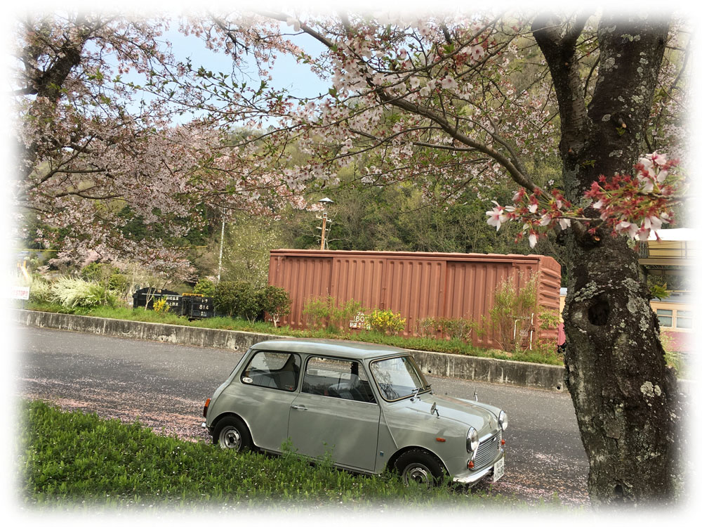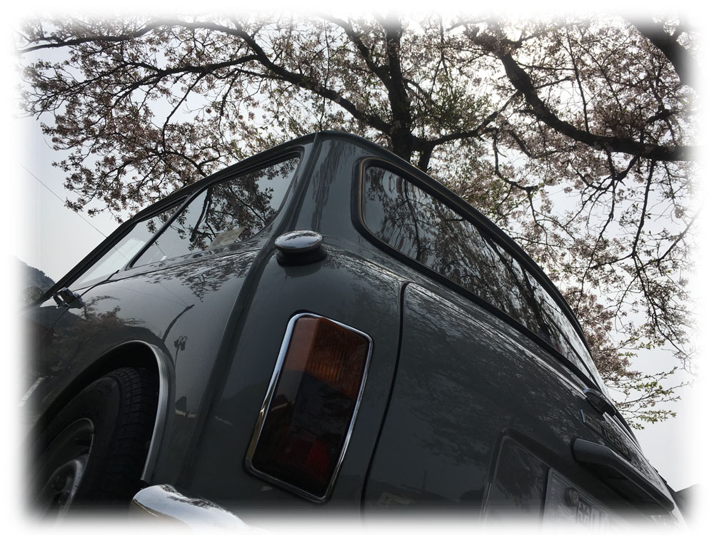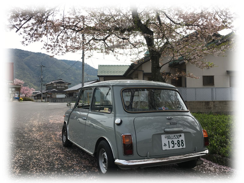 Miniの屋根に落ちた花びらと